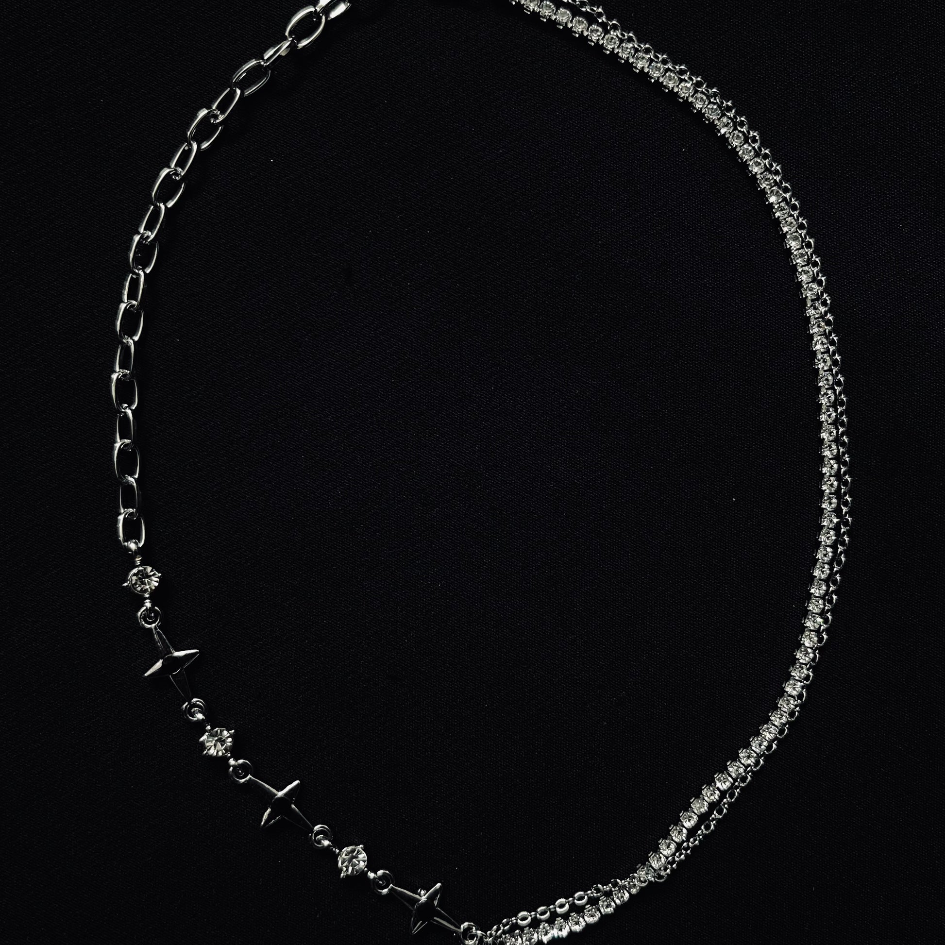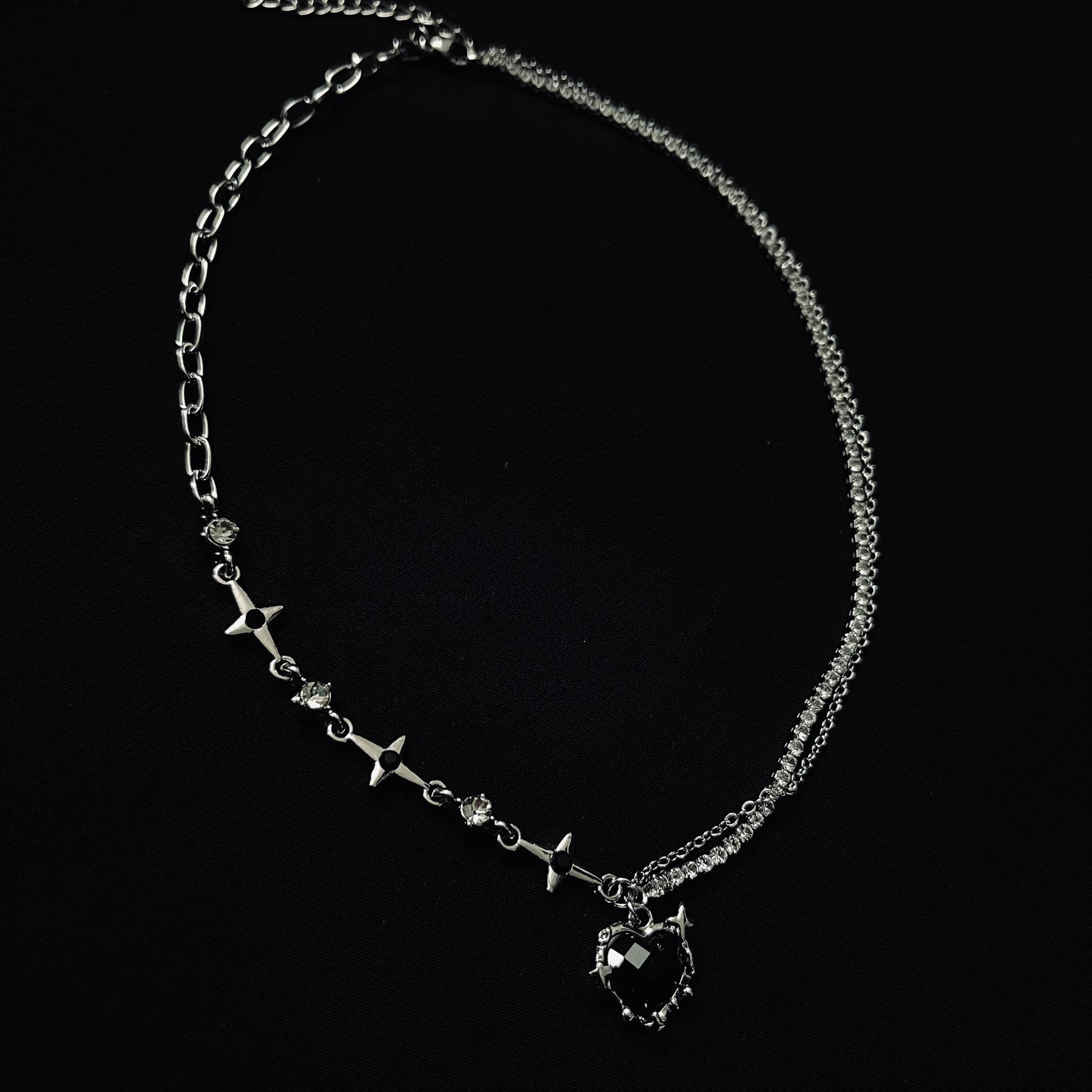 A constellation of edge and elegance. The Asymmetric Stardust Necklace is a masterclass in modern design. It features two distinct silver-tone chains: one a classic fine link, the other a bolder chain adorned with brilliant, cross-shaped accents and tiny embedded crystals. All roads lead to the captivating centerpiece: a multi-faceted black crystal heart, framed by a crown of subtle spikes. It’s a dynamic piece that adds instant intrigue and a touch of celestial shine to any outfit
