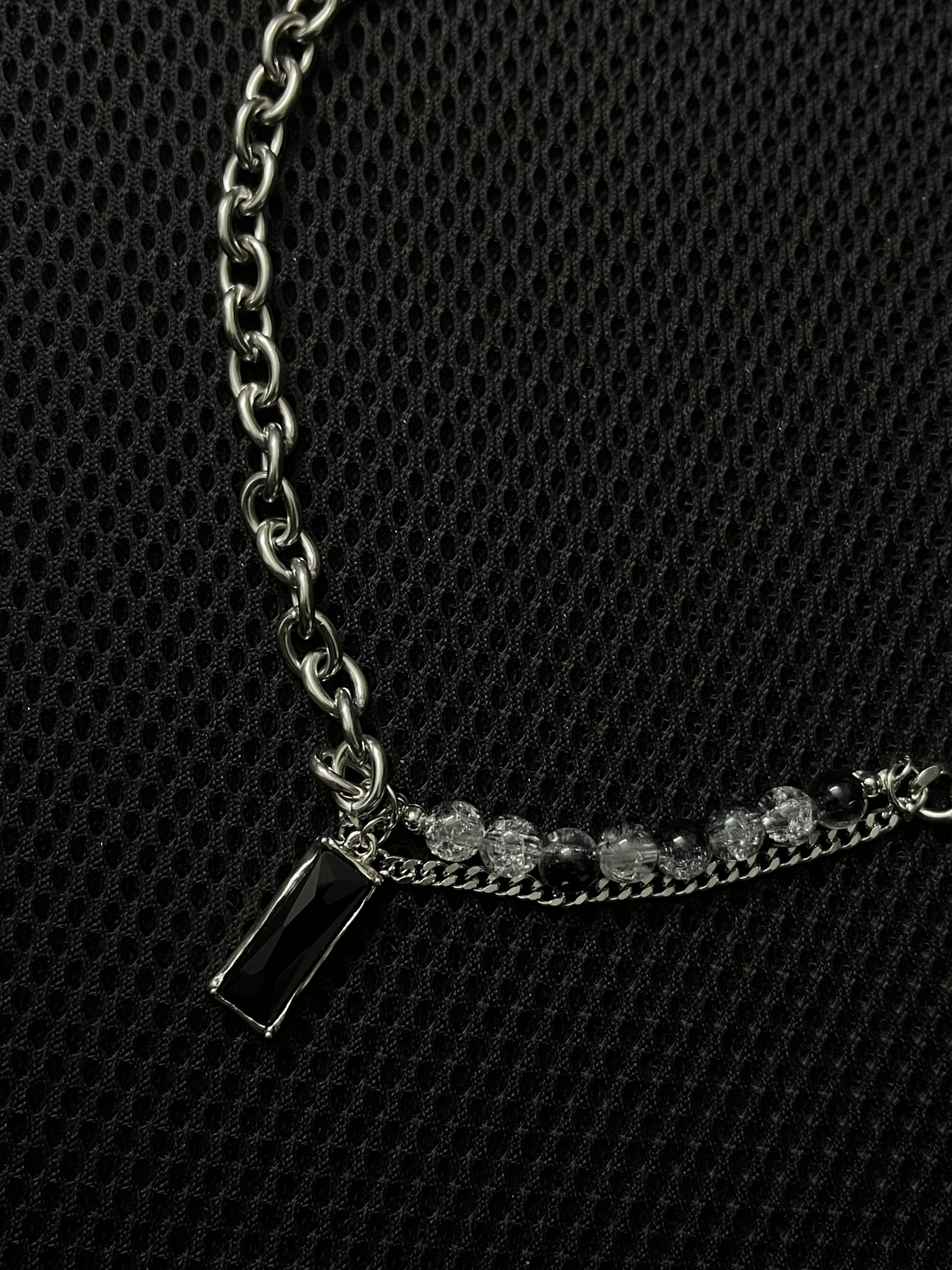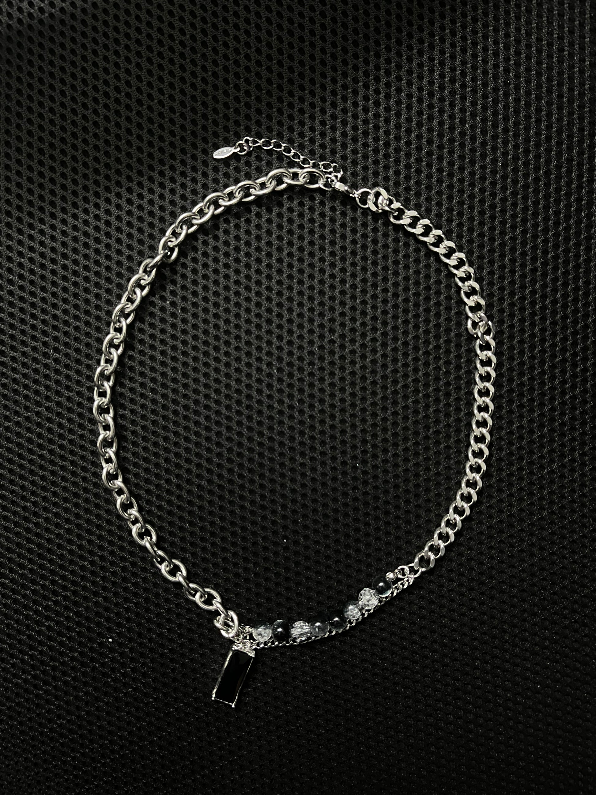 Perfectly imperfect. Powerfully styled. The Offset Shadow Choker demands attention with its bold, asymmetric design. It features a stunning split chain—one side a heavy, polished oval link and the other a tighter, classic curb chain. The meeting point is accented by a row of black and clear crystals, leading to a dramatic, polished black rectangular pendant. This piece is the definition of contemporary edge and is an essential accessory for a high-impact, minimalist punk look