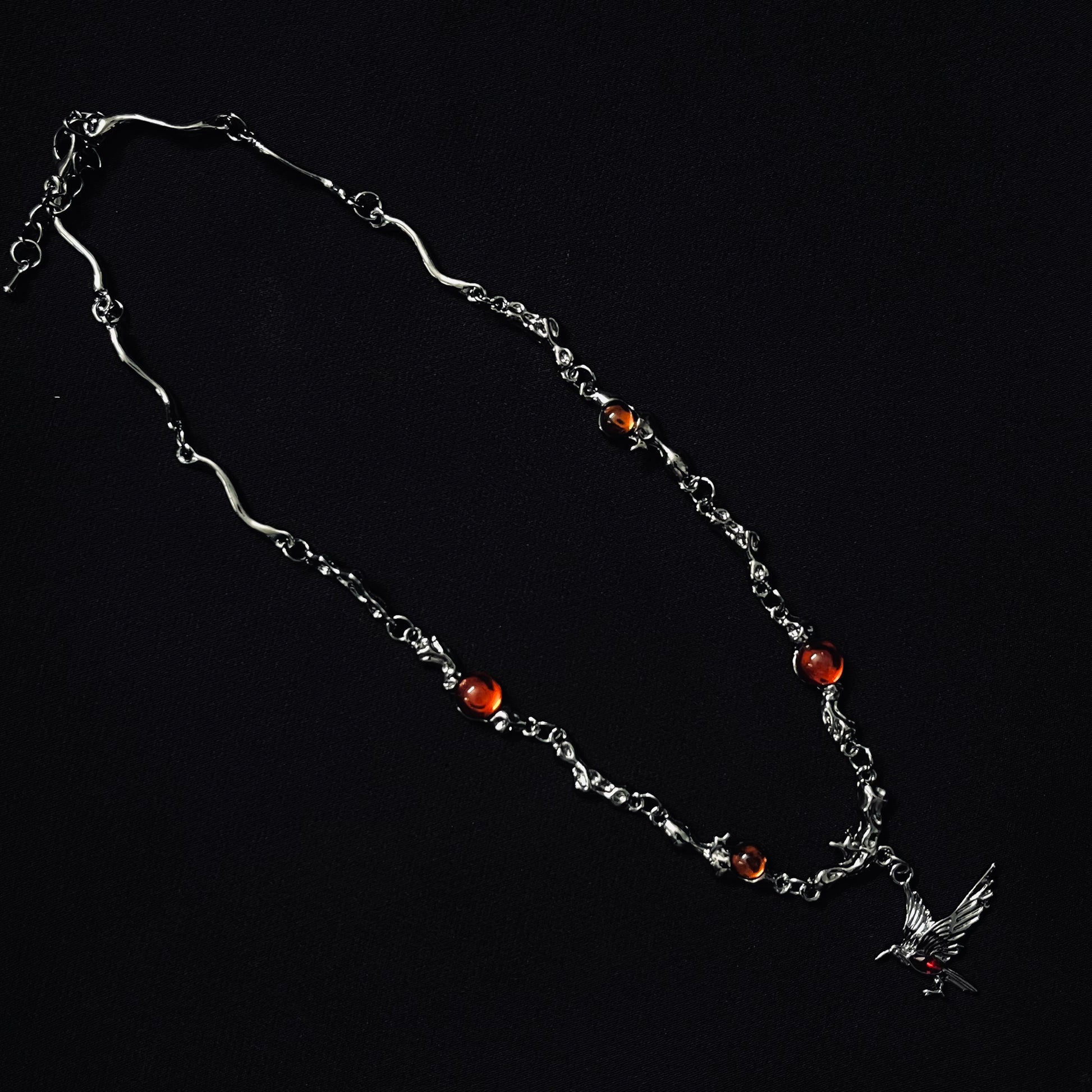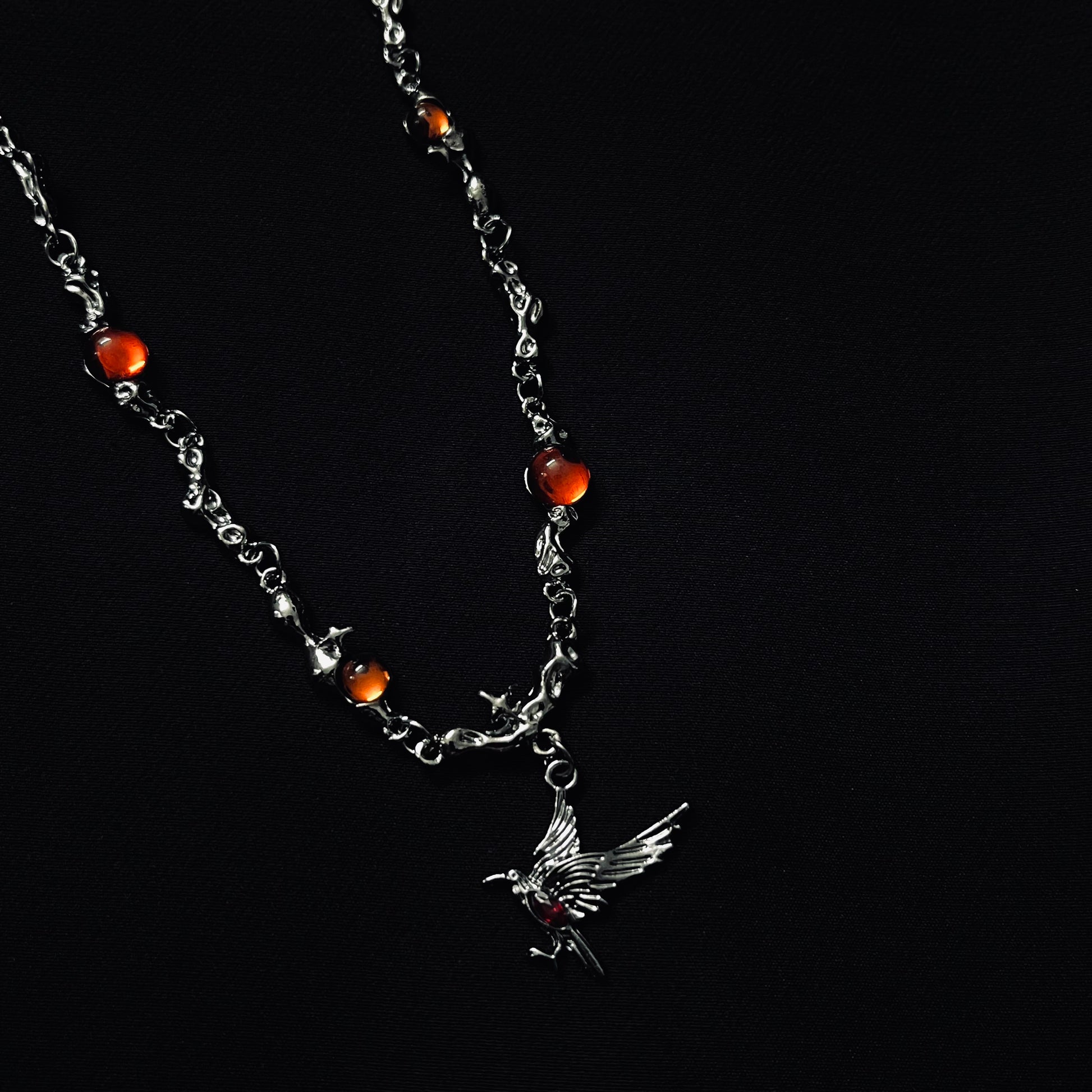 Capturing fire and flight. The Inferno Talon Necklace makes an unforgettable statement. It pairs a textured, edgy chain adorned with fiery amber-toned beads with a sharply detailed bird-of-prey pendant. The overall design is bold, dynamic, and perfect for those who favor a unique gothic, punk, or dark bohemian style.