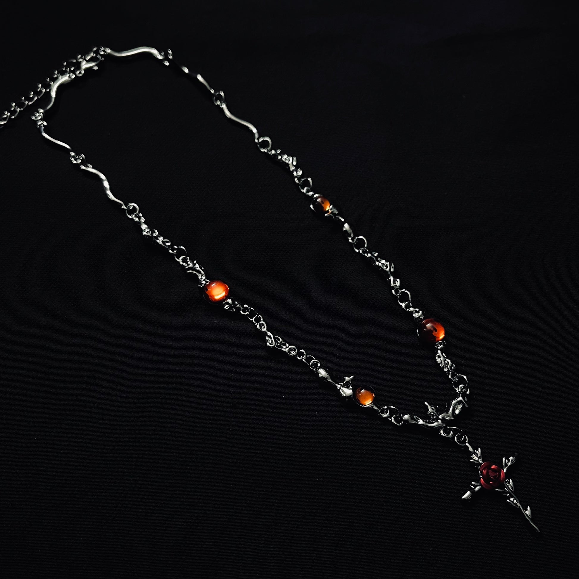 Love, wild and untamed. The Thorn & Ember Choker embodies the passion and pain of dark romance. The chain is intricately crafted with a detailed thorny vine design, punctuated by fiery amber-red crystal beads. A single, striking blood-red rose pendant, set on a thorn-covered stem, hangs at the center. It's a breathtaking piece for those who appreciate beauty mixed with a dangerous edge.