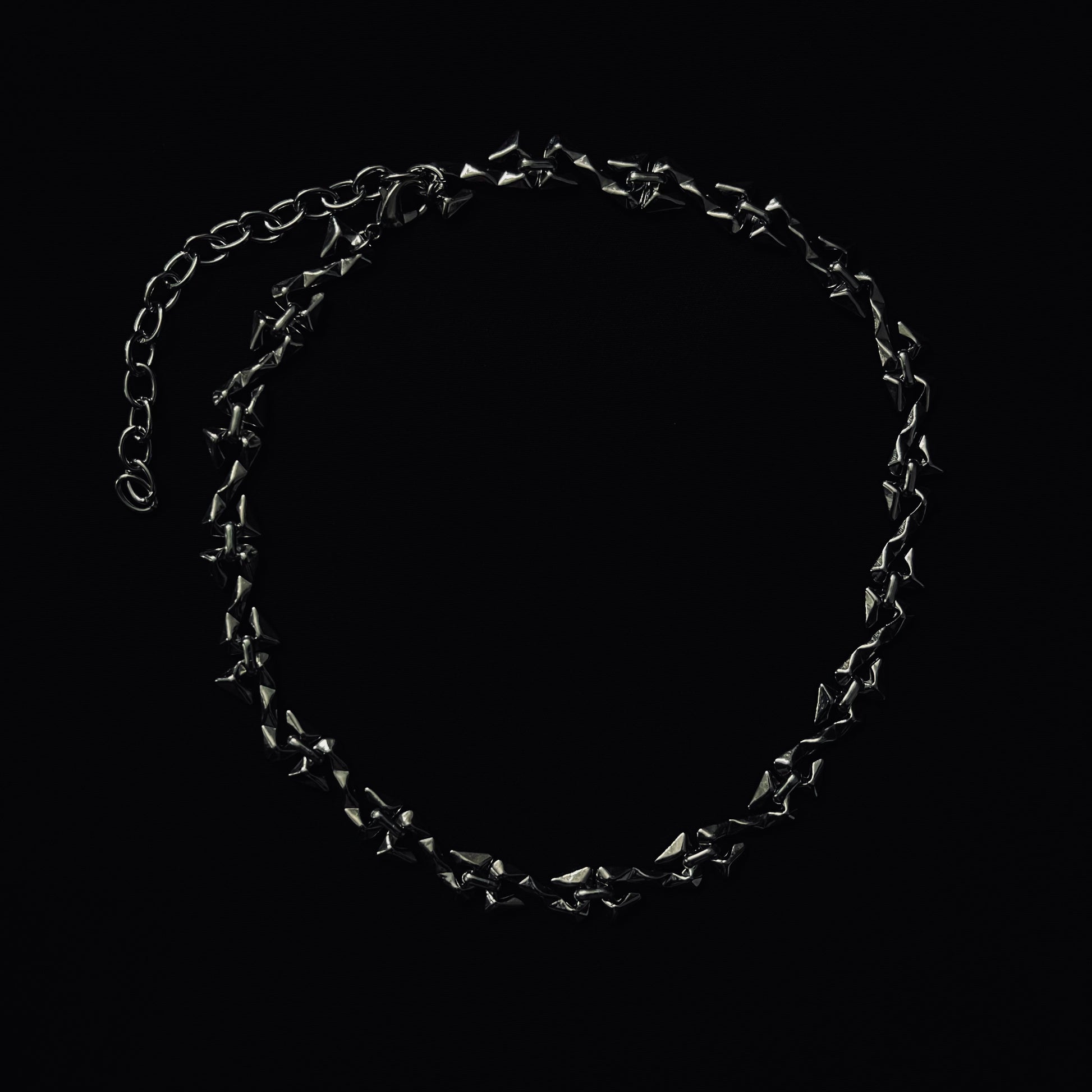 Unleash your inner rebel. Crafted with a series of sharp, miniature pyramid-like spikes, the Apex Choker commands attention without saying a word. Its polished finish catches the light with every move, offering a powerful blend of punk attitude and high-fashion edge. Perfect for those who dare to stand out. Features an adjustable extension chain for the perfect fit.
